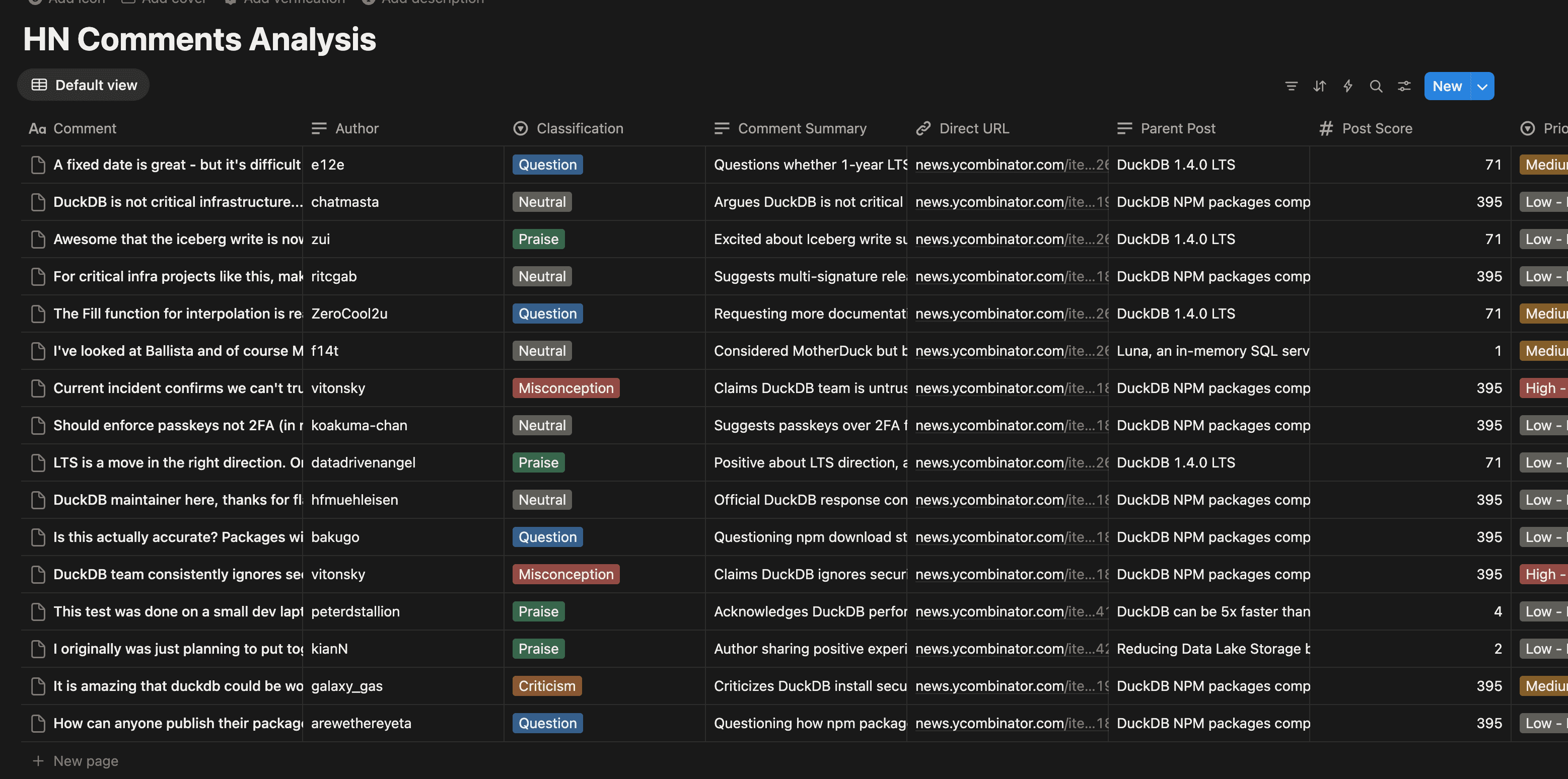 Find all HackerNews posts mentioning "DuckDB" or "MotherDuck" from 2024, sorted by score. For each top discussion: 1. Summarize what people are talking about 2. Highlight comments that are questions or misconceptions we should respond to Create a Notion page called "HN Community Intel" with this analysis.