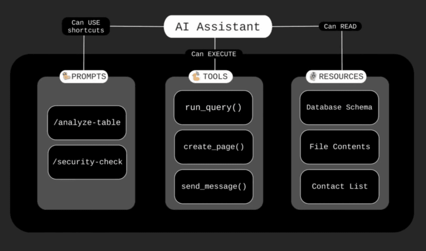 Think of these as slash commands. A database MCP might offer a /analyze-table prompt that automatically structures how the AI examines your data. A code review MCP might have /security-check. Instead of you writing detailed instructions every time, you pick a pre-made template.