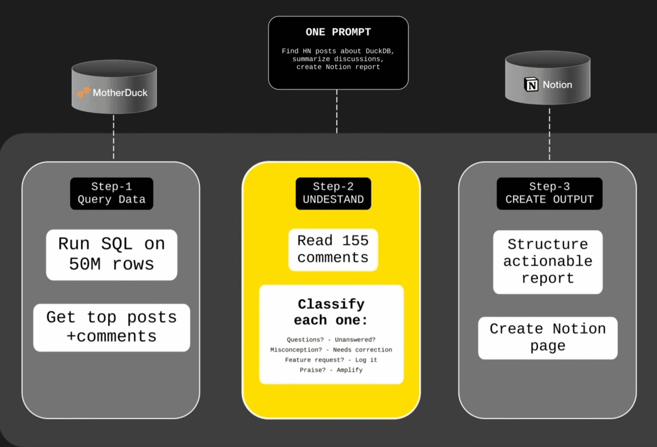 Step 1 — Query Data. It calls MotherDuck. Running SQL across 50 million rows of HackerNews data. Finds posts mentioning DuckDB. Gets the top discussions. Pulls the comments.