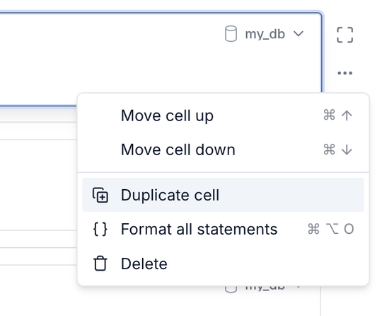 - Duplicate MotherDuck notebook cells: Duplicate cells in MotherDuck UI notebooks using the cell options menu or command menu. Access the duplicate option from the three-dot options menu on any cell, or use